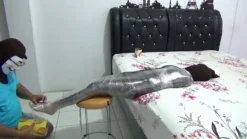 A beautiful girl is wrapped in a room using 3 layers of leggings and plastic. First this girl’s body was wrapped in black leggings then white and finally black. After that, this girl’s body was wrapped in plastic so that it was multi-layered and this girl became difficult to move.