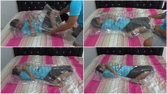 A girl is wrapped in a plastic bag and then vacuumed until she runs out of oxygen. The girl’s body in the vacuumed plastic became tight and couldn’t move