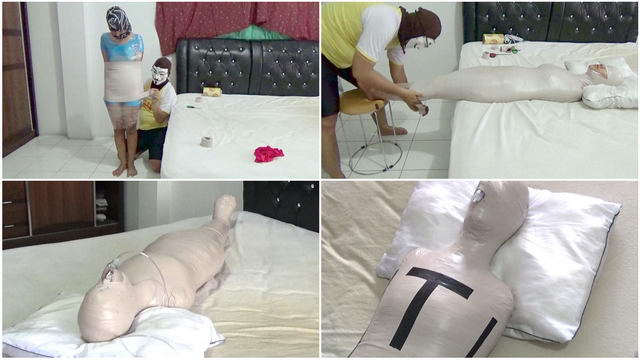 A beautiful girl is mummified in a room using white duct tape. The girl’s body was wrapped tightly and then she was put on an oxygen mask so that her breath became heavy