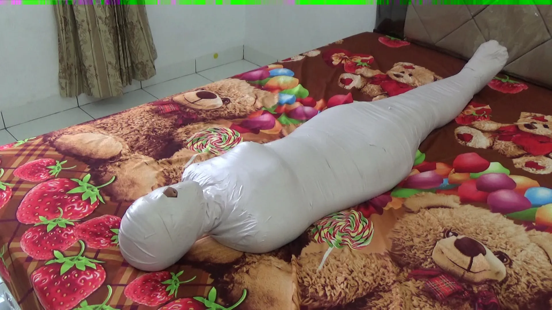 A beautiful girl feels for the first time what it is like to be a living mummy wrapped tightly with white duct tape.