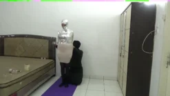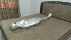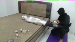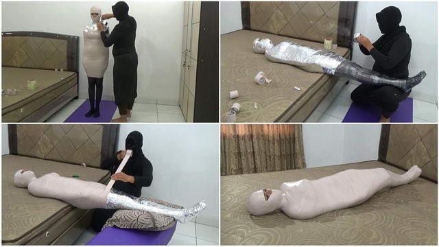 A beautiful Pakistani girl is mummified until her body is stiff using 3 duct tape ferns. The first duct tape used was cardboard duct tape, followed by chrome duct tape and ending with white duct tape. The 3 layers of the package are very strong, tight and make the girl’s body stiff and difficult to move.