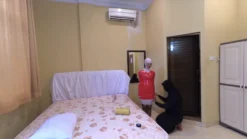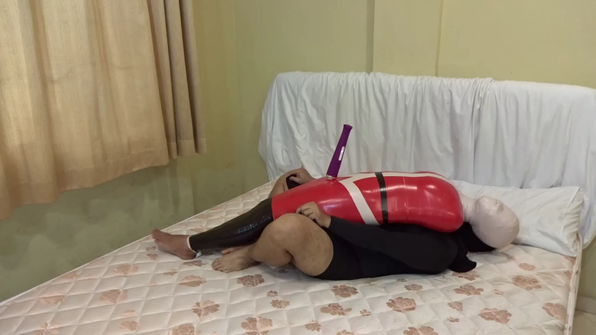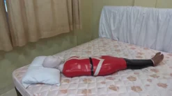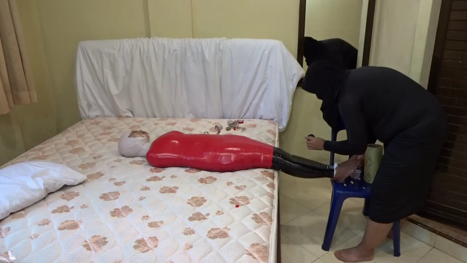A girl was mummified using 2 colors of duct tape, namely white and red duct tape. This girl’s body is wrapped helplessly on a Christmas theme on Christmas Eve. The girl is then toyed with with a dildo, raised high, standing up to add 1 layer of legings.