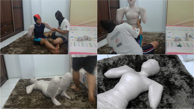 A beautiful girl wearing a swimsuit wrapped in a mummy frogtied position. This girl then struggled to the left and right to ask to be removed after she had her nose wrapped and could not breathe